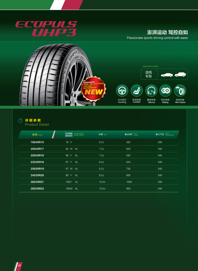 全新設計運動(dòng)型花紋,應用高含量白炭黑配方,提供優(yōu)秀的抗濕滑性能,澎湃運動(dòng),駕控自如。