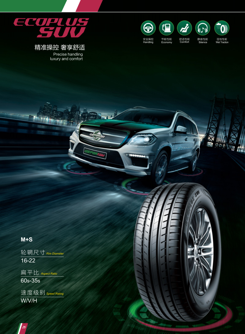 SUV專(zhuān)用輪胎,靜音胎面,超強抓地設計,精準操控。