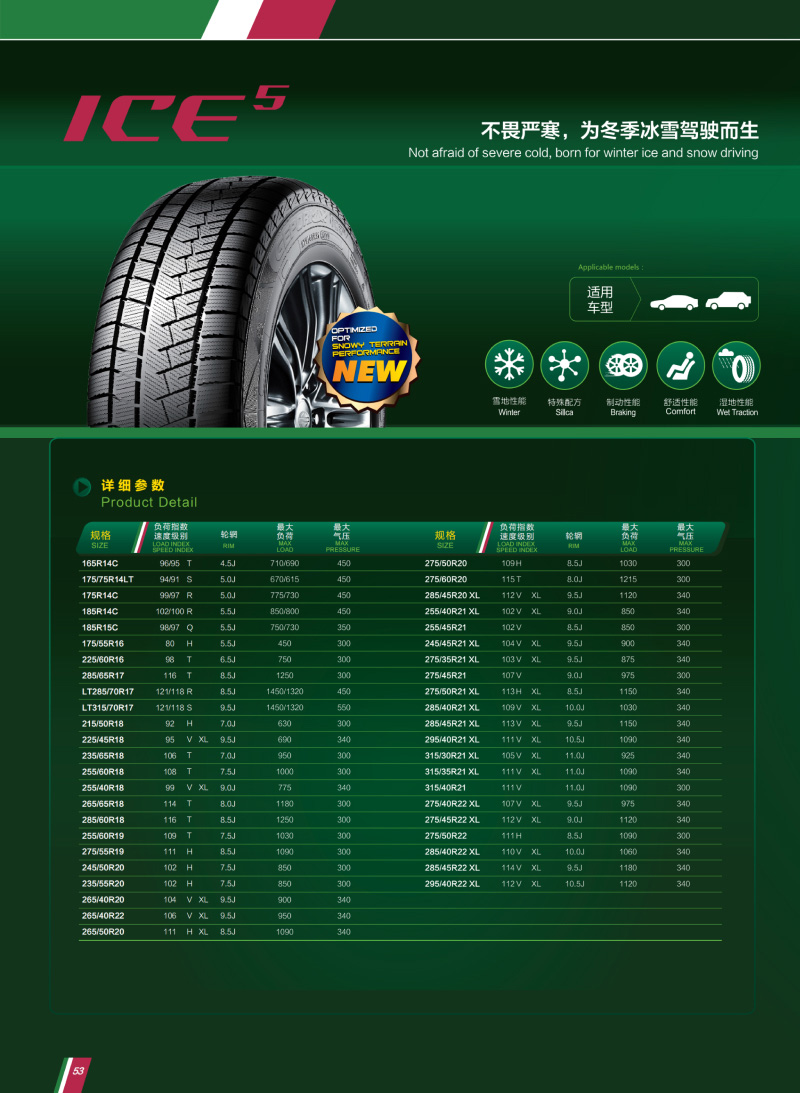 全新花紋和耐寒配方,為冬季冰雪駕駛而生,在冰雪路況下提供更有效的行駛和轉彎穩定性,并可適用于新能源汽車(chē)。